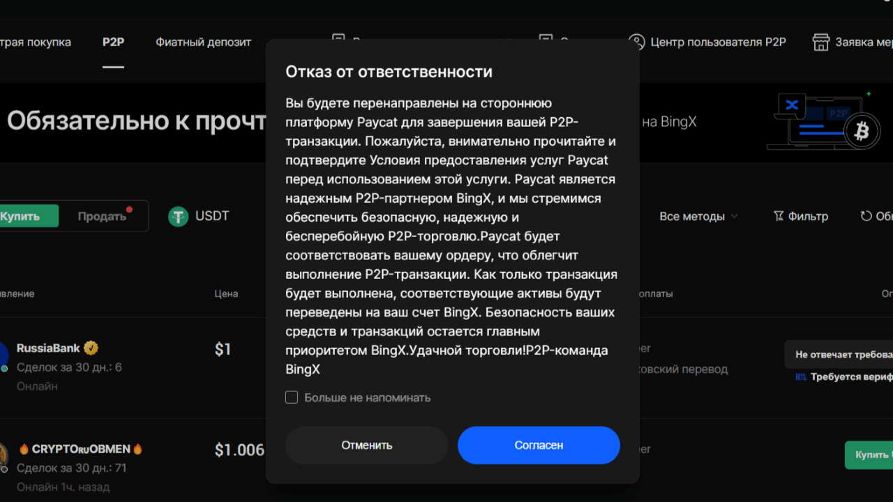 BingX на P2P очень удобна в использовании, здесь простой интерфейс, огромный выбор банков, с которых можно за рубли покупать стейблкоин USDT. Почта Банк, ПСБ, Росбанк, ВТБ, Россельхозбанк, Сбер и прочие национальные платежные системы России здесь работают без сбоев. Если не устраивают банки, есть поддержка Киви-кошелька. Торговые сборы, как правило, находятся на конкурентоспособном уровне, а еще BingX славится своими акциями и бонусами, которые привлекают новых трейдеров.