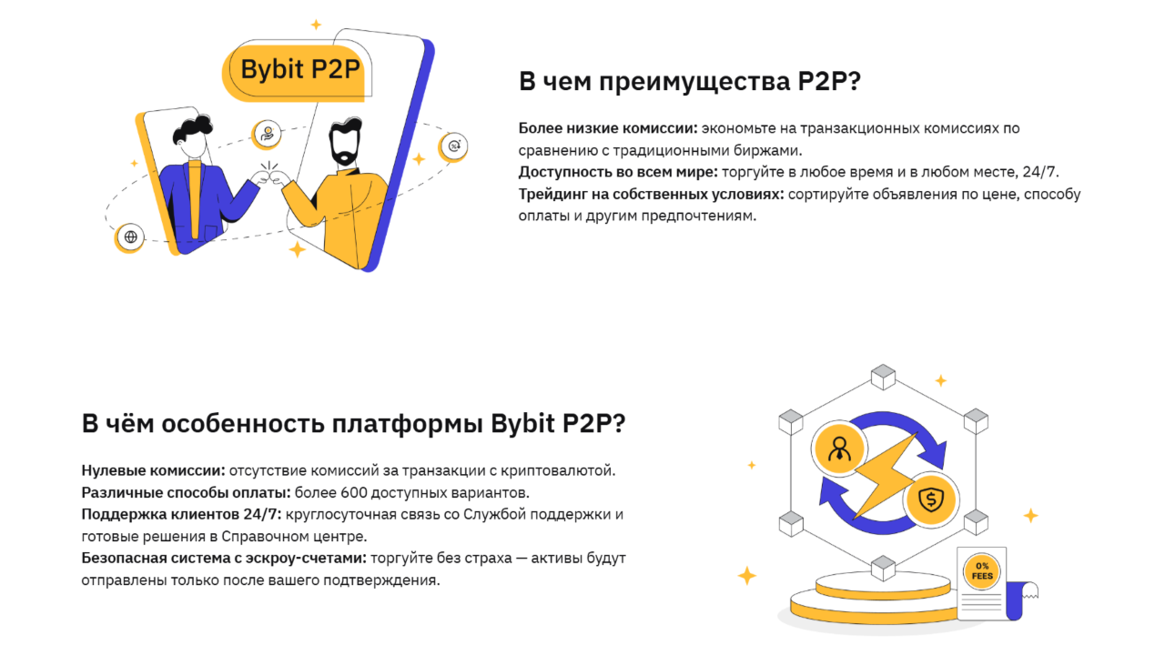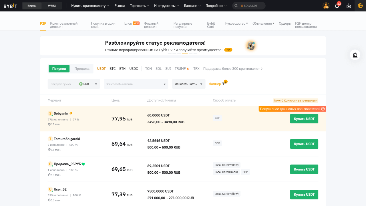 Bybit предоставляет одну из лучших площадок P2P обмена криптовалютами для россиян, за счет поддержки национальной валюты и основных банков, таких как БКС, Сбер, ПСБ, Т-Банк, Русский стандарт и так далее. Можно использовать переводы, СБП. Поддерживает стейблкоины USDT, USDC и более 300 криптовалют, включая BTC, ETH. На бирже адекватные комиссии, множество акций и интересных заданий, за выполнение которых можно получать вознаграждения.