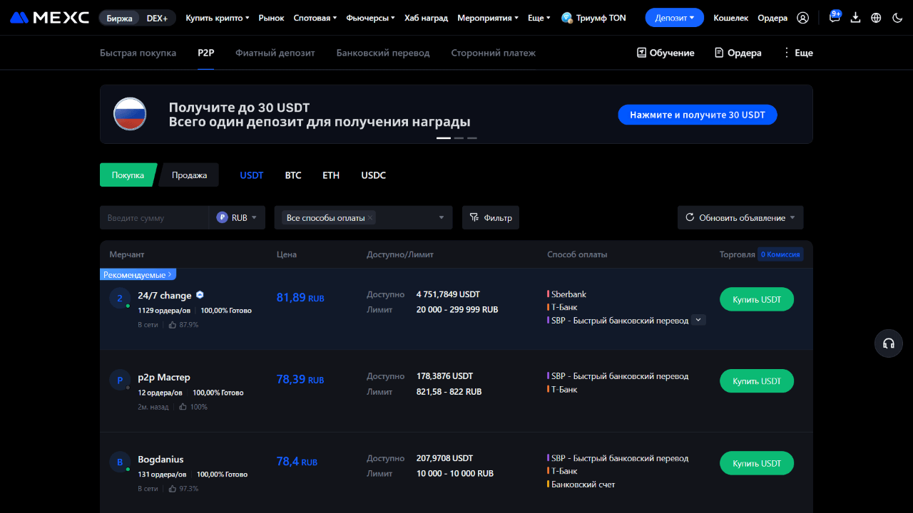 MEXC также предлагает P2P-трейдинг с рублем. Можно приобрести стейблокины USDT, USDC и криптовалюты BTC, ETH. Для российских пользователей выбор банков обширный: санкционные Сбер, Т-банк, также можно использовать карты и счета Газпромбанк, Русский Стандарт, Почта Банк и прочие популярные в России платежные средства. Комиссии невысокие, а еще есть приветственные бонусы, акции, события, на которых можно заработать скидки или пополнить свои активы.