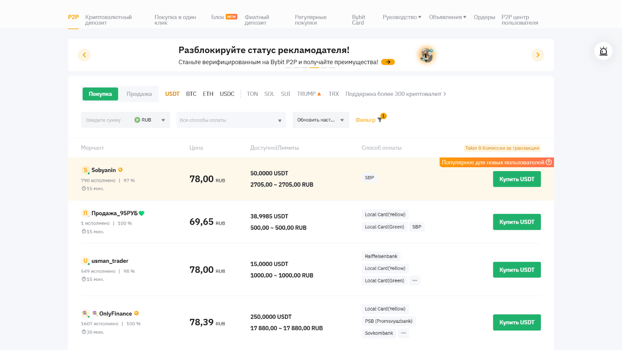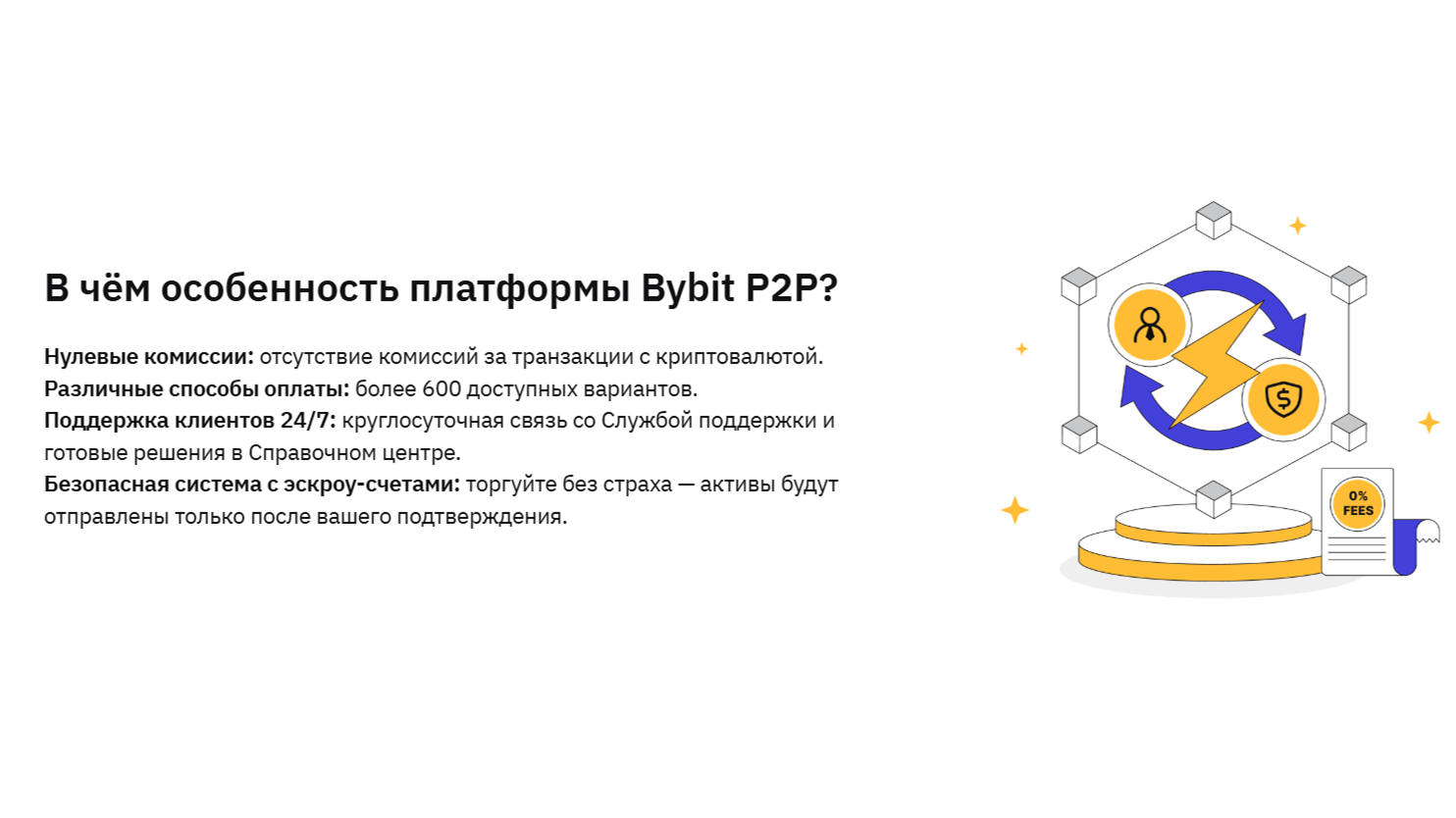 Bybit P2P давно зарекомендовала себя как надежный сервис для торговли криптовалютами, предлагающий интуитивно простой интерфейс и отсутствие комиссий.