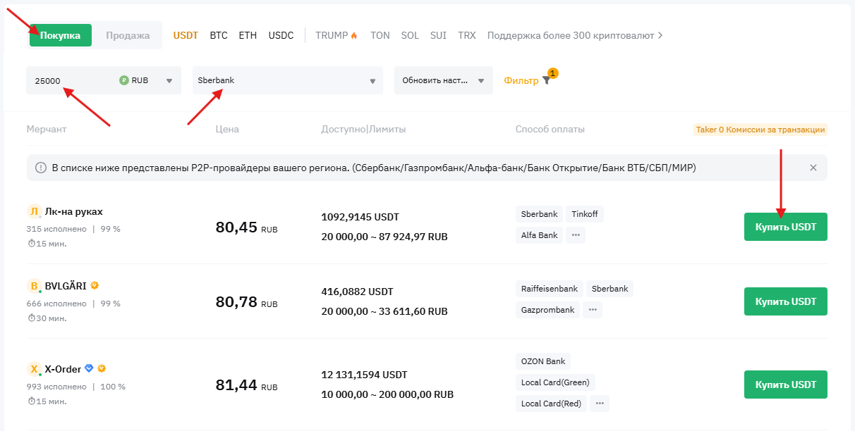 Настройте фильтры для мейкеров указав все необходимые параметры: тип финансов, сумму, которую готовы вложить, комфортный метод платежа и так далее. Выберите подходящее объявление и кликните на кнопку «Купить USDT»