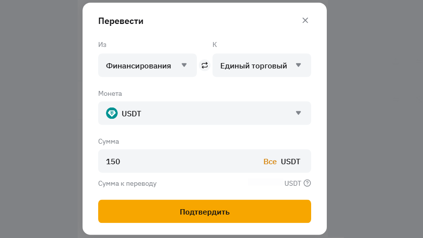Перед тем, как продать криптовалюту через Bybit P2P, следует перевести активы с единого торгового на аккаунт финансирования, как это показано выше в разделе о переводе криптовалюты из внутренних кошельков.