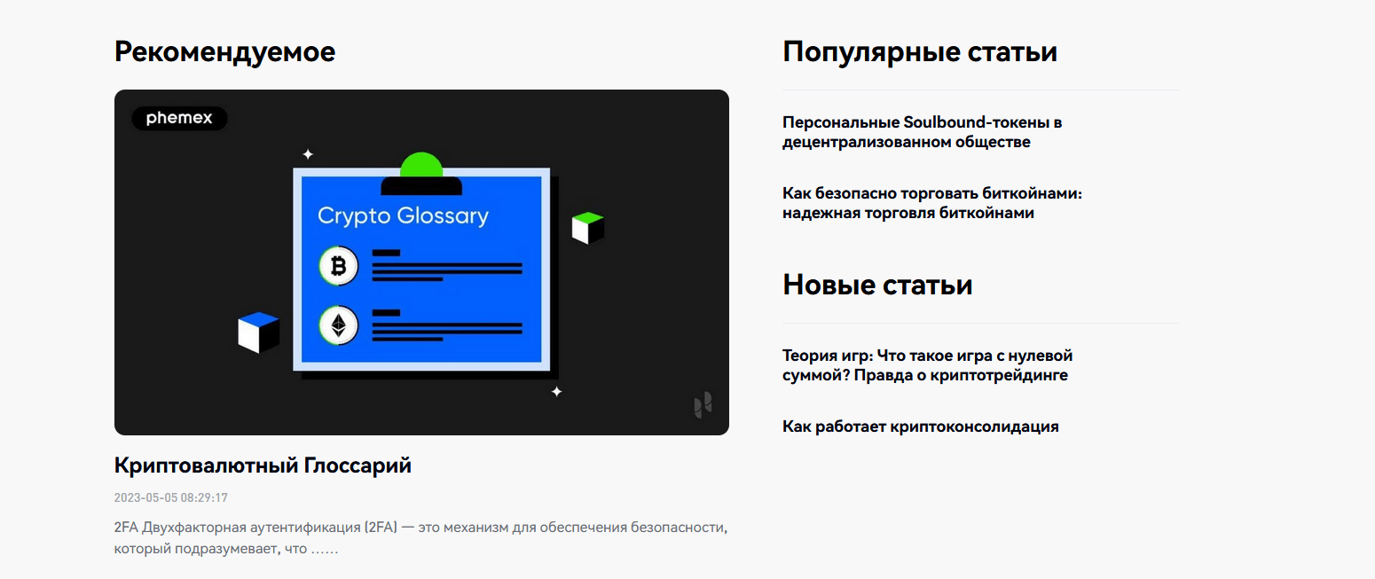 Phemex Academy предлагает образовательные материалы по криптоторговле, анализу рынков, финансовым стратегиям. Это полезный ресурс для всех, кто хочет развить свои навыки в мире цифрового криптобизнеса.