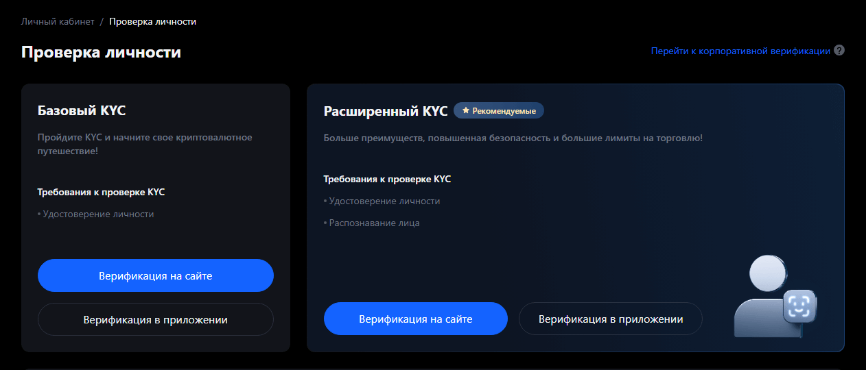 - Bybit предлагает экспресс учетку. Здесь можно быстро зарегистрироваться, а для подтверждения личности достаточно предоставить минимальный пакет — удостоверение и селфи. Есть еще верификация kyc продвинутая с адресом, но она требуется только на очень крупных выводах.